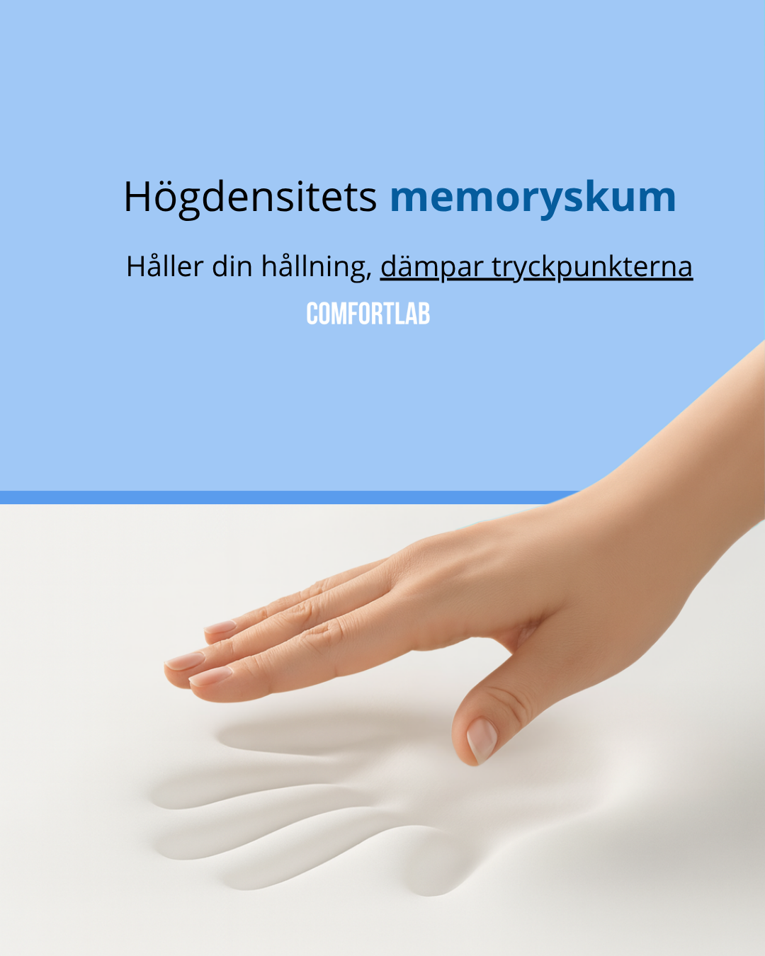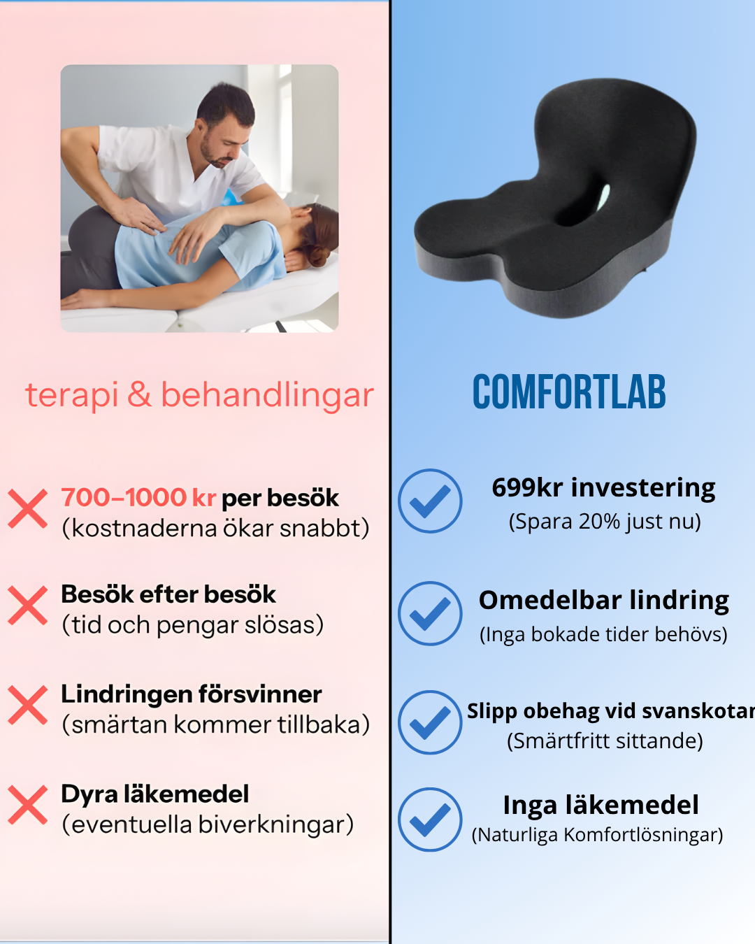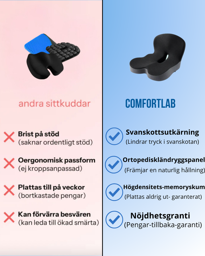 Comfortlab är framtagen för att bryta just det mönstret. Kudden lyfter höfterna i rätt vinkel, avlastar svanskotan och minskar trycket på känsliga nerver. Du får en naturligare sittställning som förbättrar blodcirkulationen och minskar risken för smärta – så att du kan sitta längre, bekvämare och utan att kroppen tar stryk.